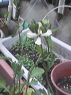 撮影場所:背後自宅 ルッコラの花。なんか、ペンダントとかストラップのモチーフになりそうです。 葉はちょっと苦味があるものの、サラダにして美味しくいただけました。 現在、種をこぼして増殖を企ててます。 |